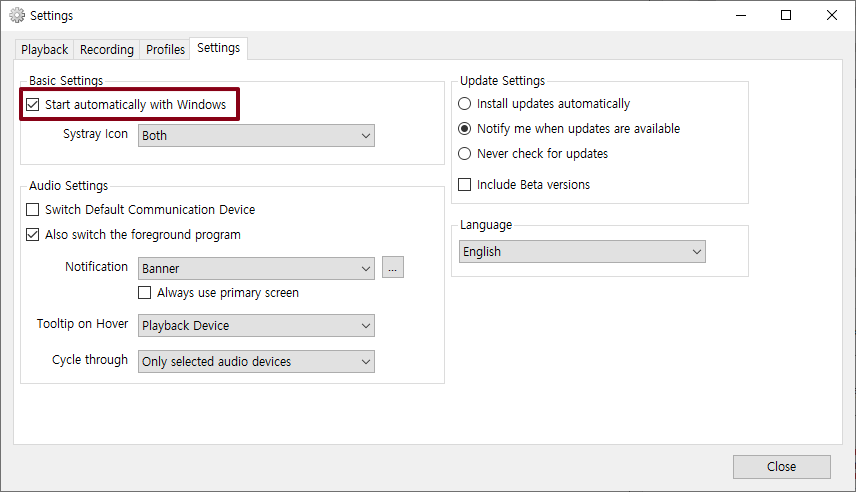 Recording Devices SoundSwitch can also take care of your recording devices. You can set specifics hotkeys as for the playback devices. Notifications SoundSwitch provides five types of notification when a device was changed. Banner Uses a custom always-on-t